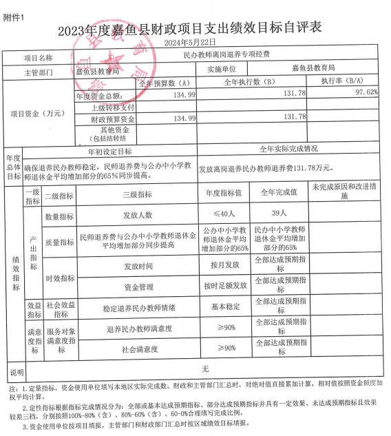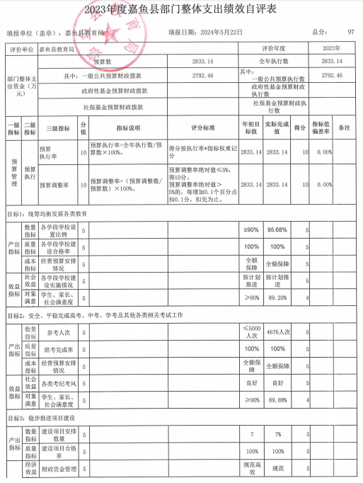 2023年度,嘉鱼县教育局绩效目标完成效果良好,自评得分97分,绩效等级为“优”。