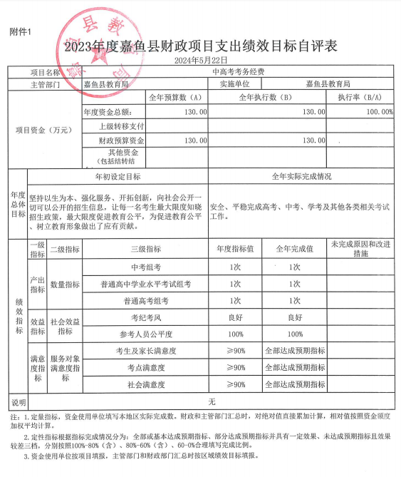中高考考务经费项目绩效自评综述:项目全年预算数为130万元,执行数为130万元,完成预算100%。主要产出和效益:安全、平稳做好高考、中考、学考及其它各类相关考试工作。改进措施:置不够规范、全面。下一步改进措施:一是科学规划、合理测算,促使部门预算与业务工作更紧密地结合,把预算编实、编准、编细;二是科学合理的对每一个项目设置绩效指标,提高预算绩效指标的针对性和可测性,充分发挥预算绩效目标管理的导向作用。三是坚持以生为本、强化服务、开拓创新,向社会公开一切可以公开的招生信息,让每一名考生最大限度知晓招生政策,最大限度促进教育公平,为促进教育公平、树立教育形象做出了应有贡献。