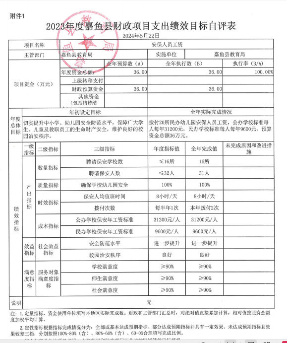 中小学校安保经费项目绩效自评综述:项目全年预算数为36万元,执行数为36万元,完成预算100%。主要产出和效益:建立健全安全管理制度,保障学生和教职员工的人身安全。下一步改进措施:一是以加强隐患排查整治为重点,进一步明确安全职责,完善工作制度,强化学校安全管理;二是加强监督检查,狠抓工作落实,形成全员参与、群防群治、齐抓共管的学校安全工作格局。切实提升中小学、幼儿园安全防范水平,保障广大学生、儿童及教职员工的生命财产安全,维护良好的校园治安秩序。