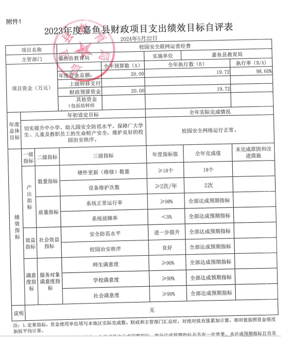 校园安全联网运营经费项目绩效自评综述:项目全年预算数为20万元,执行数为19.72万元,完成预算98.6%。主要产出和效益:校园信息安全系统正常运行,每年对监控设备进行两次维护。下一步改进措施:一是进一步抓好校园安全监管、学生平安工作,二是组织全县学校在做好各项安全监控等工作的同时,注重学生意外伤害事故的原因分析,为教育局确立学校安全防范的重点提供决策依据。