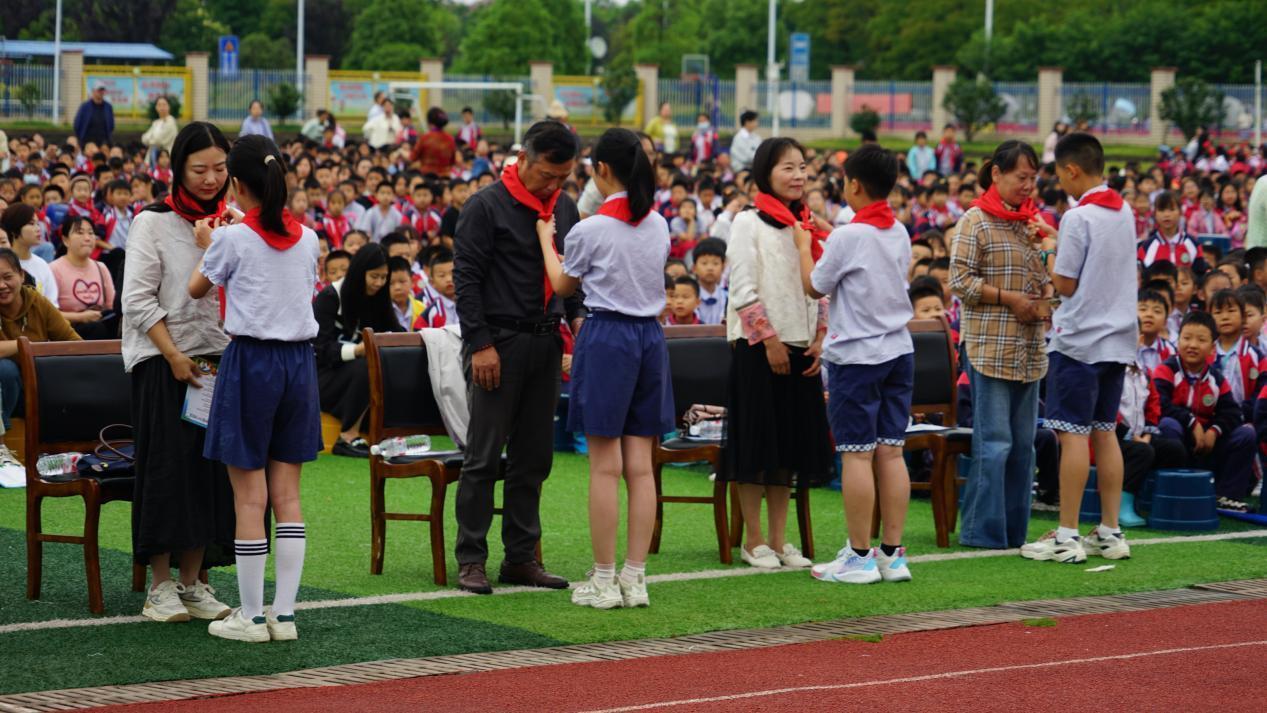 少先队员们为领导和来宾献上鲜艳的红领巾,欢迎他们来到学校共同迎接“六一”国际儿童节的到来。