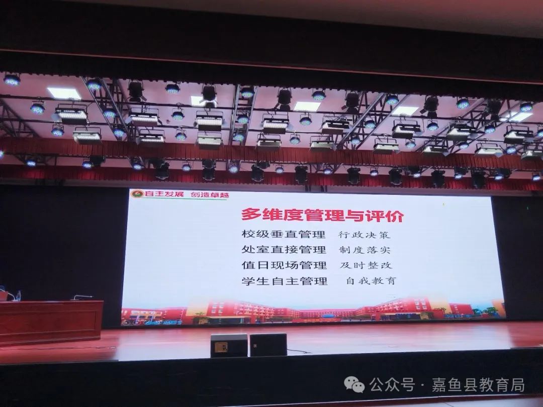 尹虹主任以“精心细化管理,打造一流班级”为主题介绍了班主任如何搞好班级管理工作。团委书记丰伦则以《学生会自主管理》为题介绍如何对学生干部进行培训,让其成为学校管理的得力助手。教学中心王军主任以《教学常规管理与评价》为题,详细介绍了该校教学的精细化管理和课堂操作培训。副校长夏四海以《创新管理 科学评价》为题,无私分享了学校的核心管理模式和科学评价机制。夏忠育校长作了题为《课程改革 赢在课堂》的讲座,他强调课程改革必须放手发动学生,让学生成为课堂主体,只有这样才能让学生快乐成长,让老师幸福生活。我校教师认真聆听、频频鼓掌,深刻领会了岳阳市第十六中学的办学理念和精神内涵。