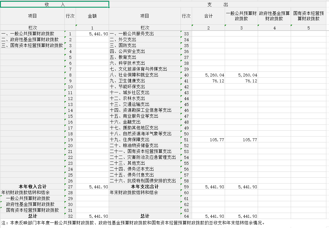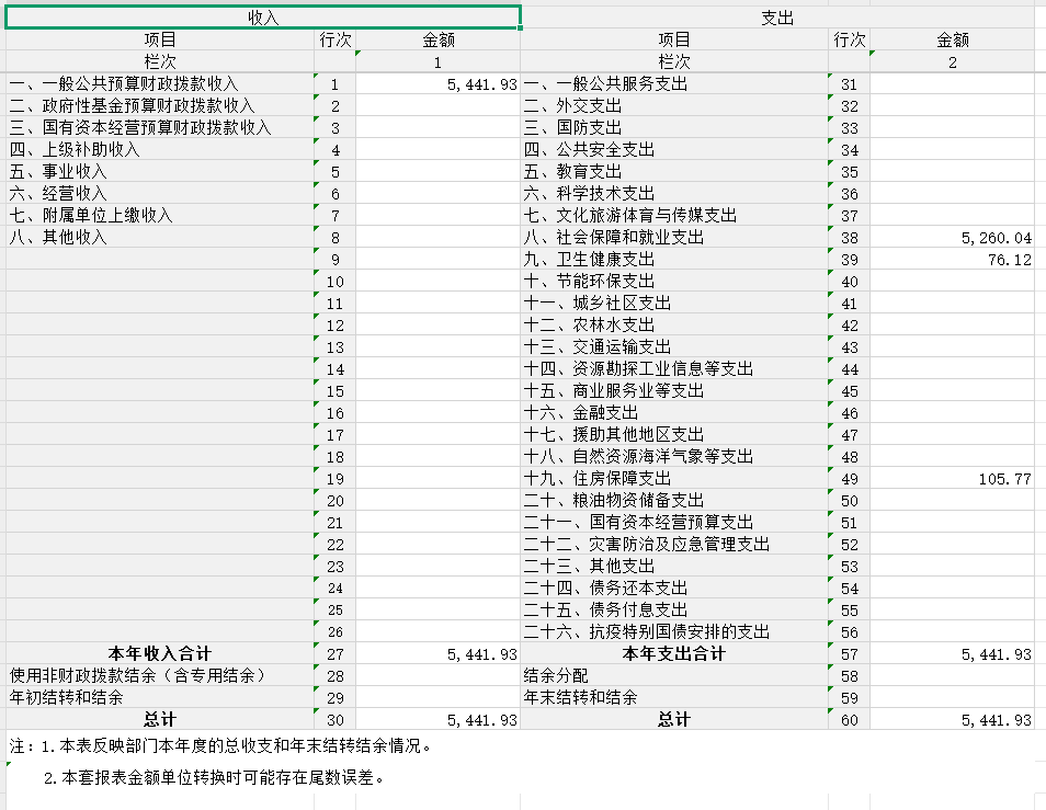 2024年度收、支总计均为5441.93 万元。与2023年度相比,收、支总计各减少535.62 万元,下降8.96%,主要原因是2024年四季度费用支付因财政关网,无法及时支付,相关费用于2025年初支付。