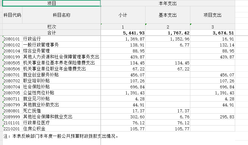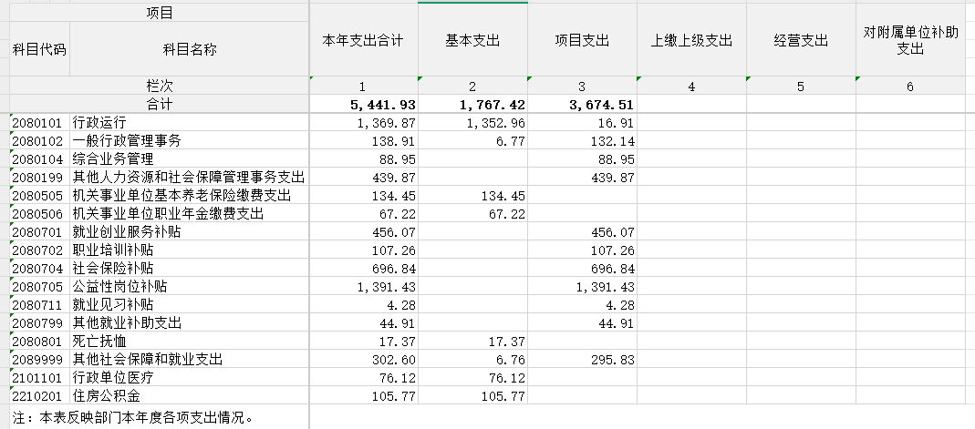2024年度支出合计5441.93万元,与2023年度相比,支出合计减少535.62万元,下降8.96%。其中:基本支出1767.42万元,占本年支出32.48%;项目支出3674.51万元,占本年支出67.52%;上缴上级支出0万元,占本年支出0%;经营支出0万元,占本年支出0%;对附属单位补助支出0万元,占本年支出0%。
