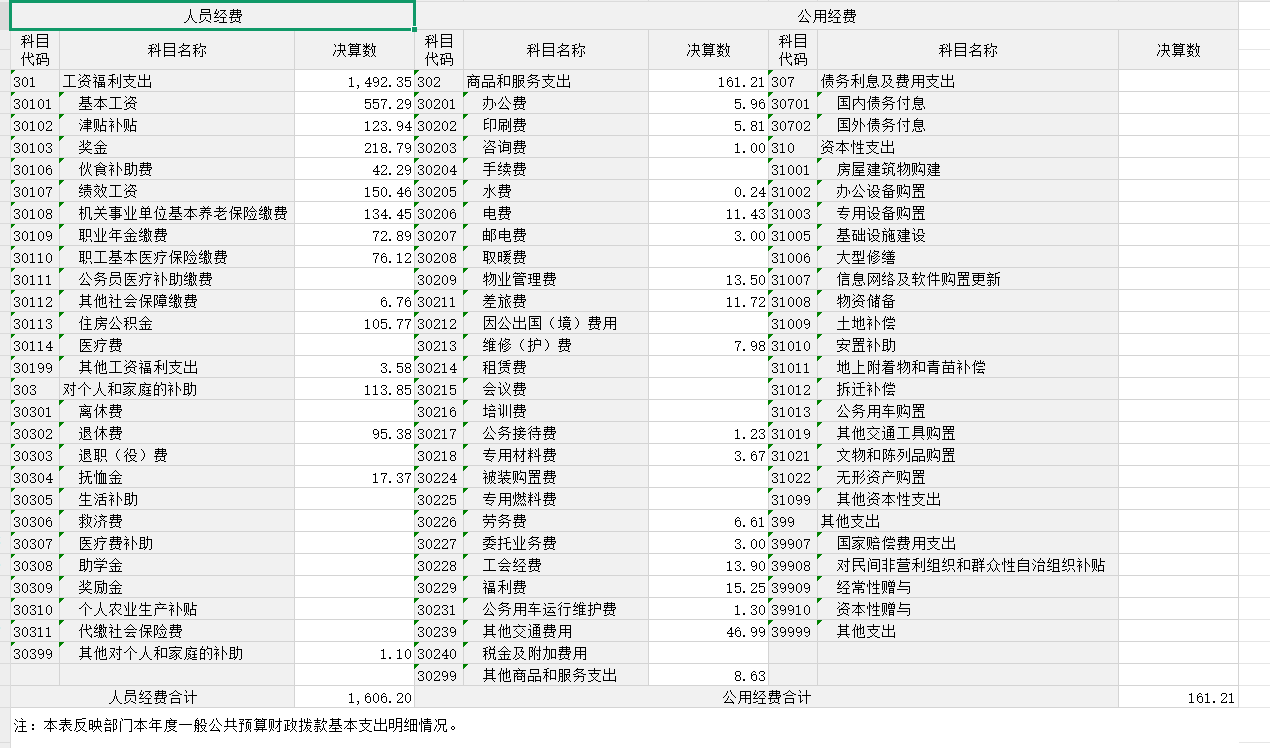 人员经费1606.20万元,主要包括:基本工资、津贴补贴、奖金、伙食补助费、绩效工资、机关事业单位基本养老保险缴费、职业年金缴费、职工基本医疗保险缴费、公务员医疗补助缴费、其他社会保障缴费、住房公积金、医疗费、其他工资福利支出、离休费、退休费、退职(役)费、抚恤金、生活补助、救济费、医疗费补助、助学金、奖励金、个人农业生产补贴、代缴社会保险费、其他对个人和家庭的补助。