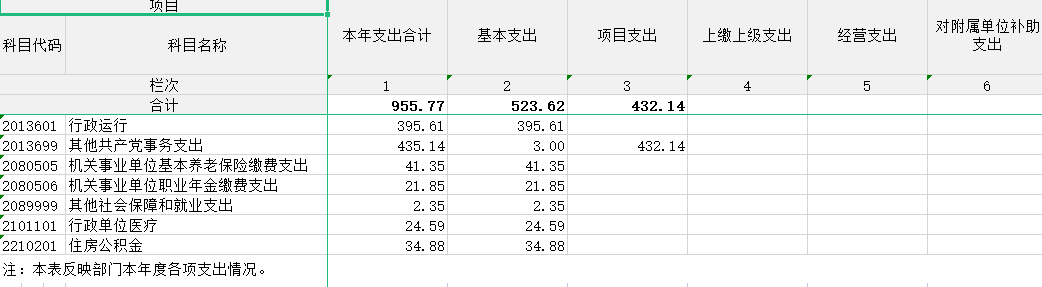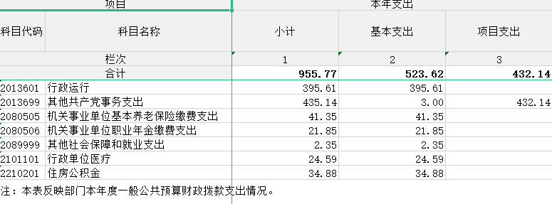 2024年度支出合计955.77万元,与2023年度相比,支出合计减少157.97万元,下降14.18%。其中:基本支出523.62万元,占本年支出54.79%;项目支出432.14万元,占本年支出45.21%;上缴上级支出0万元,占本年支出0%;经营支出0万元,占本年支出0%;对附属单位补助支出0万元,占本年支出0%。