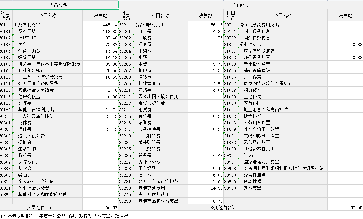 公用经费57.05万元,主要包括:办公费、印刷费、咨询费、手续费、水费、电费、邮电费、取暖费、物业管理费、差旅费、因公出国(境)费用、维修(护)费、租赁费、会议费、培训费、公务接待费、专用材料费、被装购置费、专用燃料费、劳务费、委托业务费、工会经费、福利费、公务用车运行维护费、其他交通费用、税金及附加费用、其他商品和服务支出、办公设备购置、专用设备购置、信息网络及软件购置更新、公务用车购置、其他资本性支出。