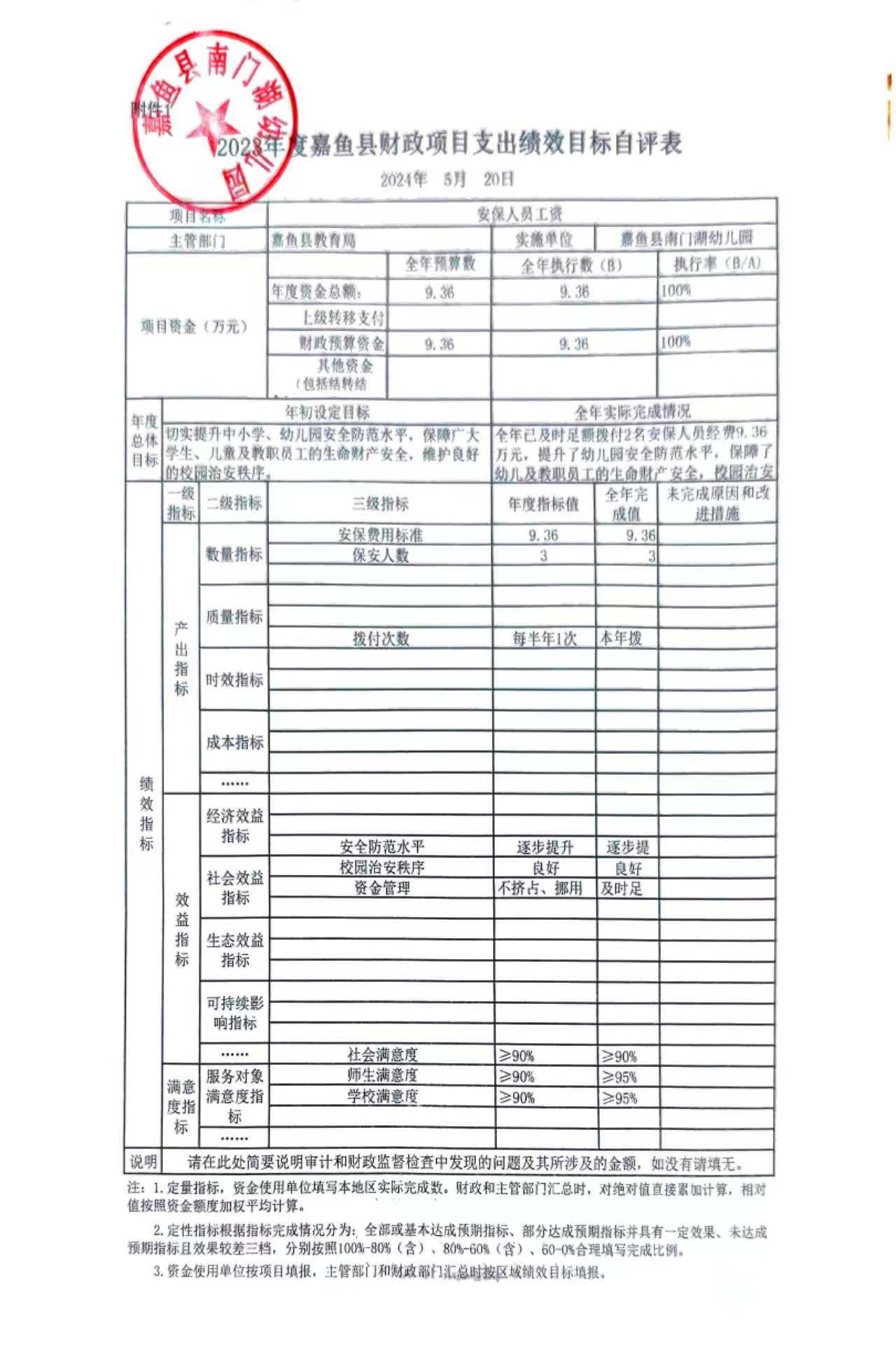 一、2024年度嘉鱼县南门湖幼儿园整体绩效评价自评表或(报告)