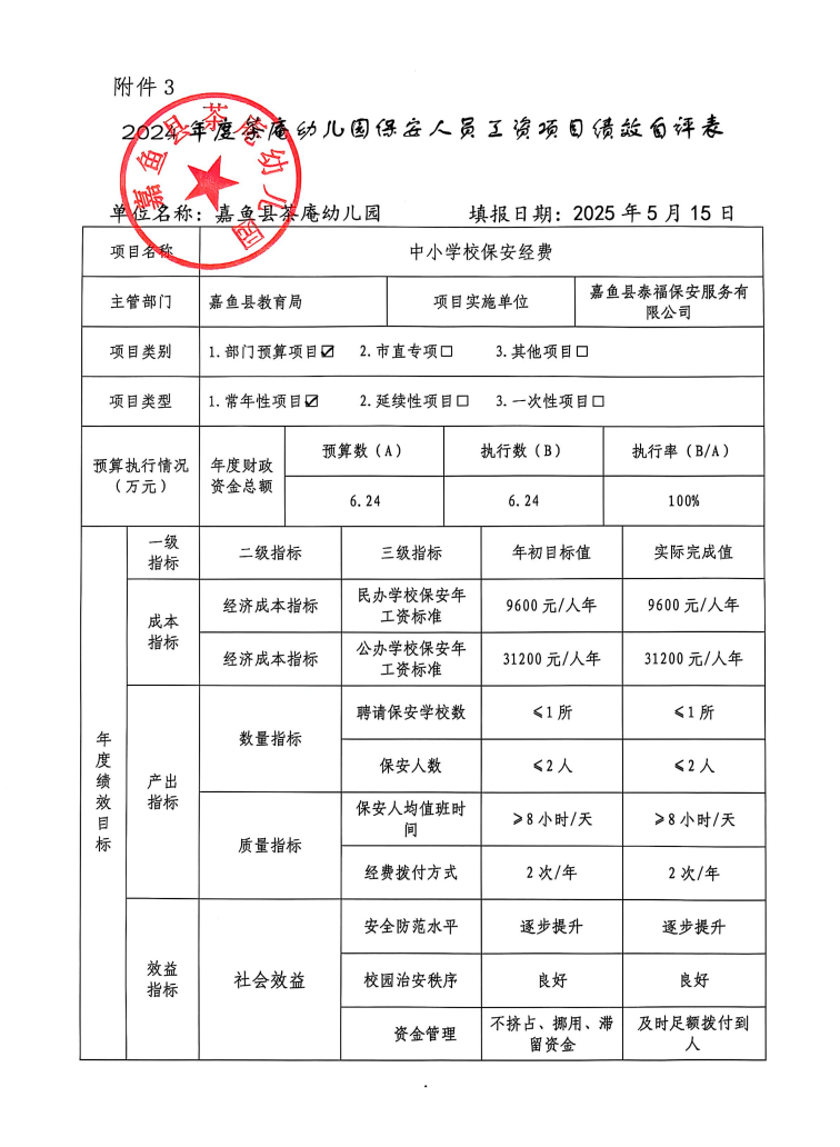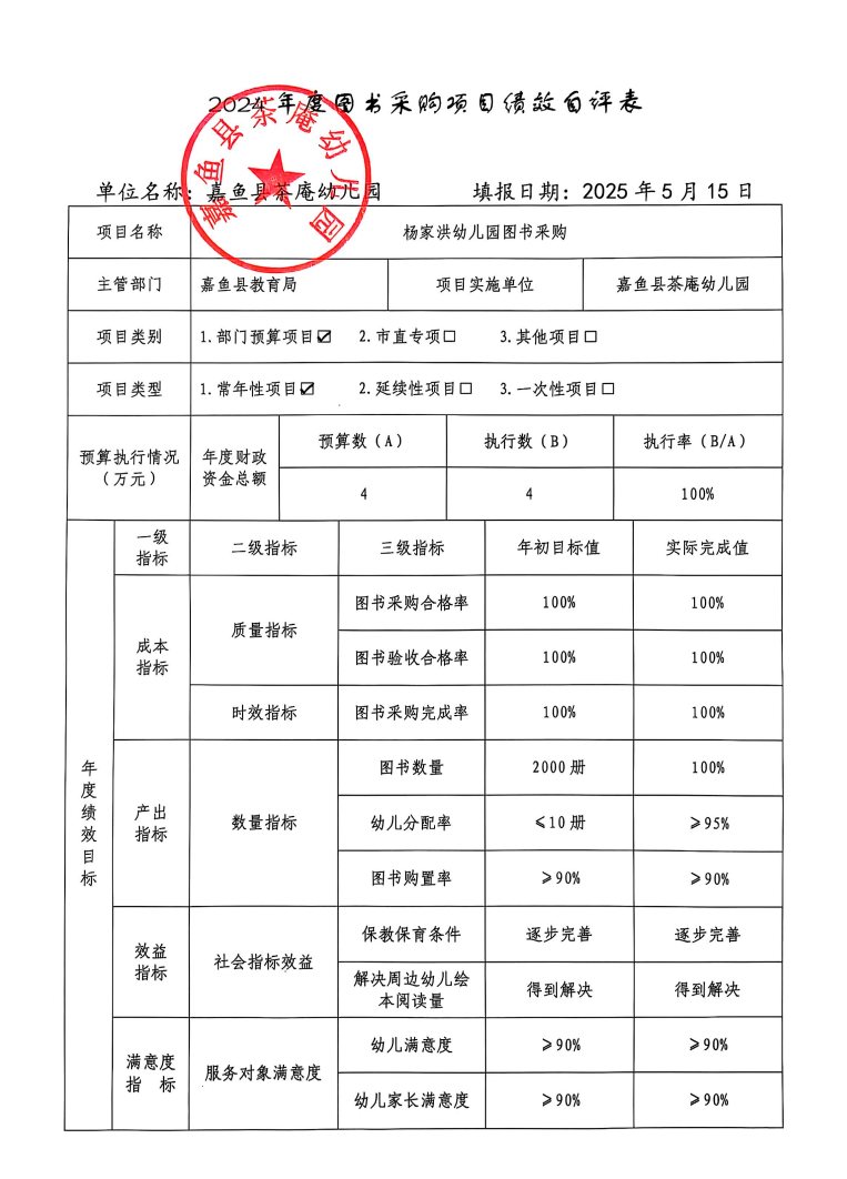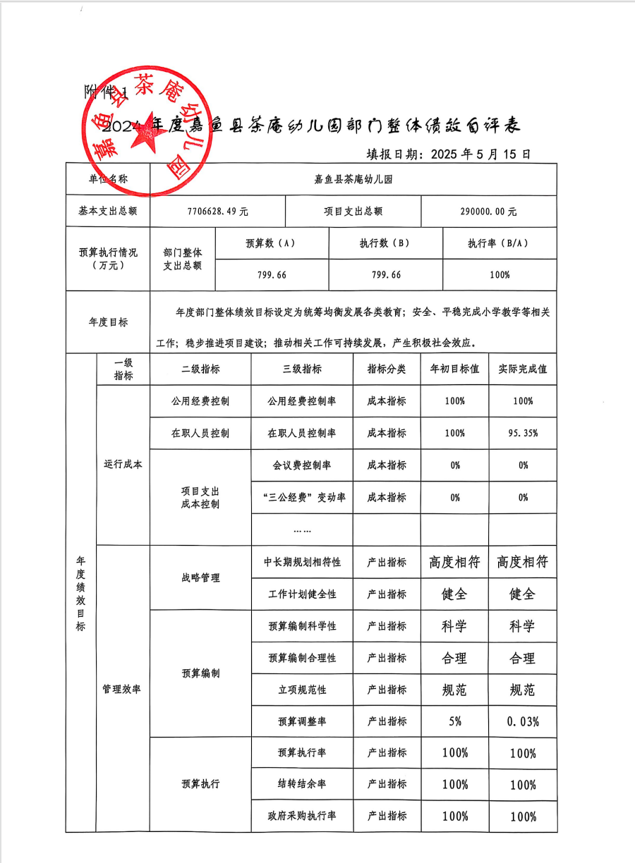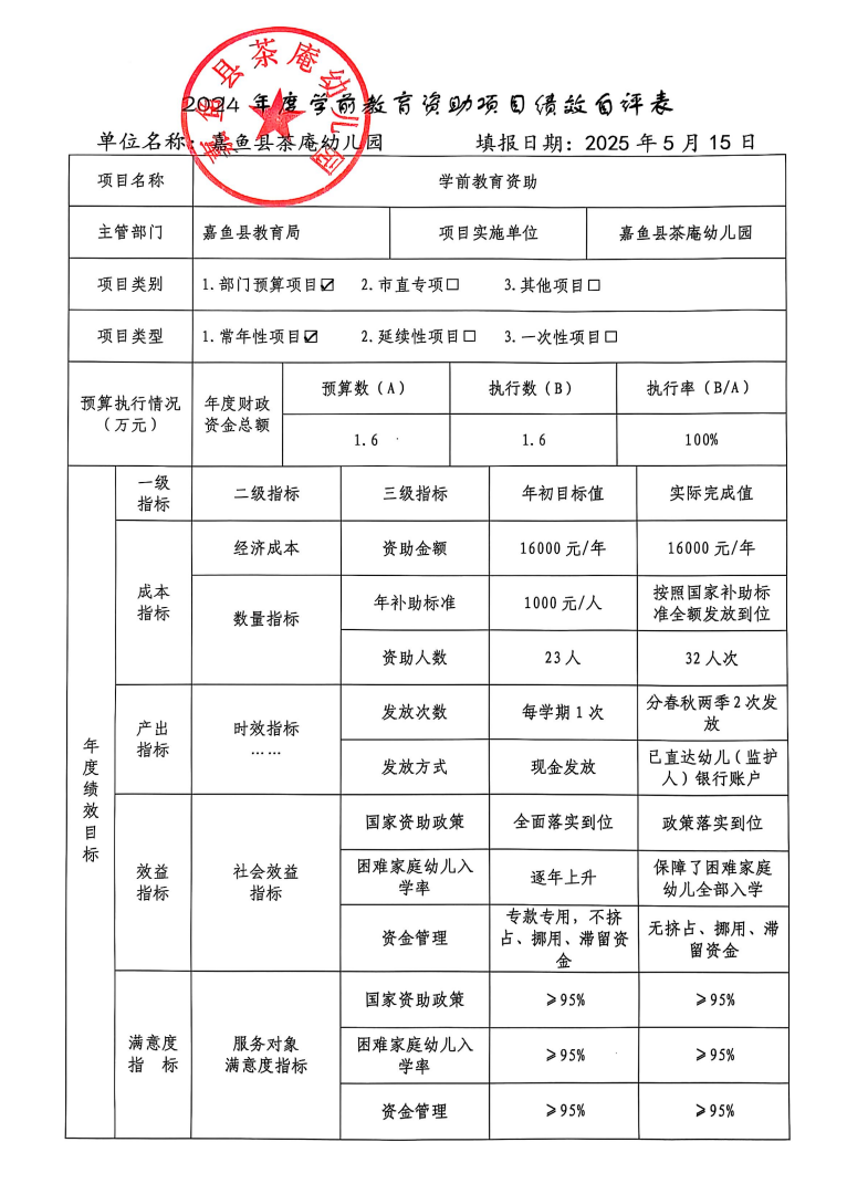 一、2024年度嘉鱼县茶庵幼儿园整体绩效评价自评表或(报告)