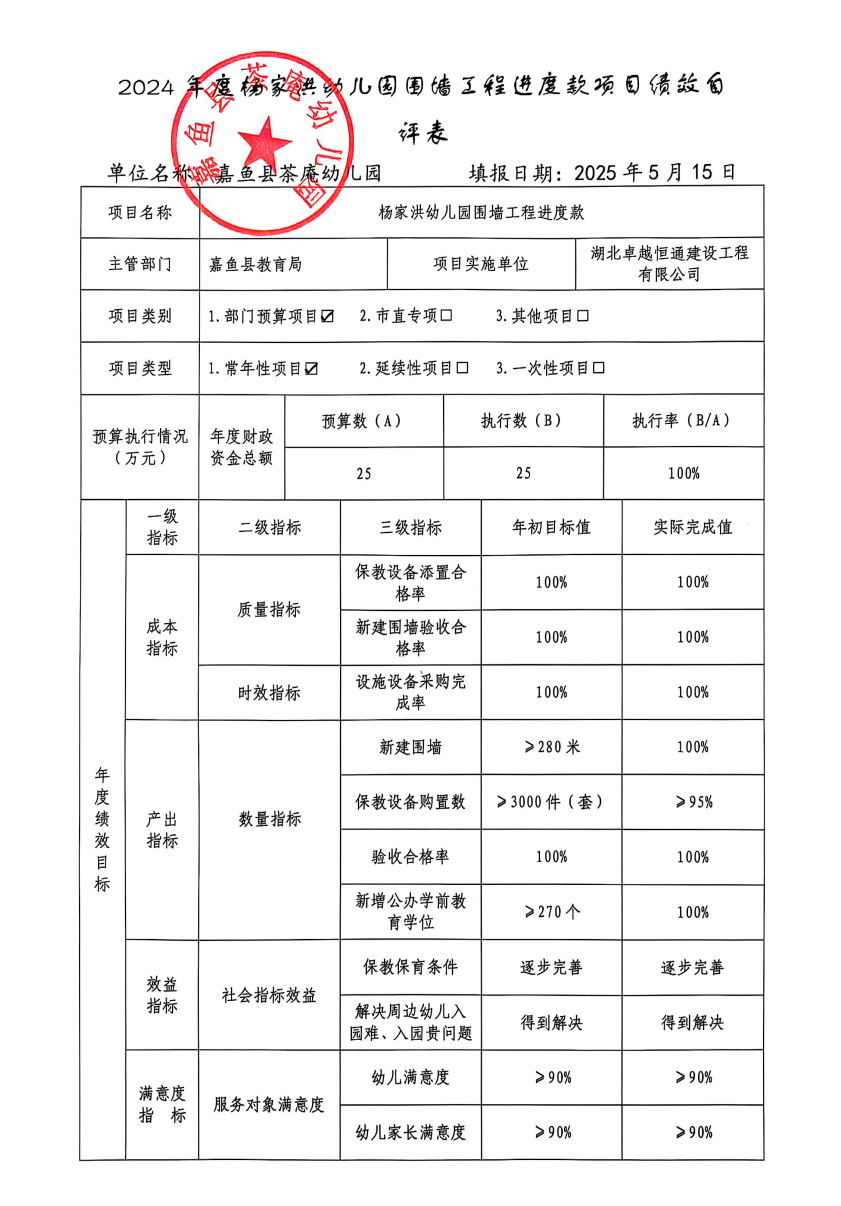 杨家洪幼儿园围墙工程进度款项目绩效综述:项目全年预算数为25万元,执行数为25万元,完成预算100%。主要产出和效益:新建围墙280米,新增保教设备购置数3000件(套),新增公办学前教育学位270个。下一步改进措施:一是逐步完善保教保育条件,解决周边幼儿入园难、入园贵问题。二是提升幼儿园教学质量和教育环境;优化教学设施设备,提高教学效果;安全合理利用资金,确保工程建设质量。