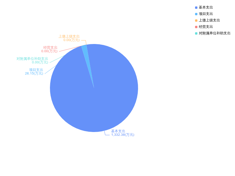 2024年度支出合计1358.54万元,与2023年度相比,支出合计减少859.06万元,下降38.7%。其中:基本支出1332.38万元,占本年支出98.1%;项目支出26.15万元,占本年支出1.9%;上缴上级支出0.00万元,占本年支出0.0%;经营支出0.00万元,占本年支出0.0%;对附属单位补助支出0.00万元,占本年支出0.0%。