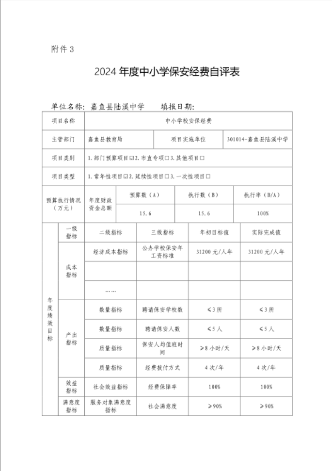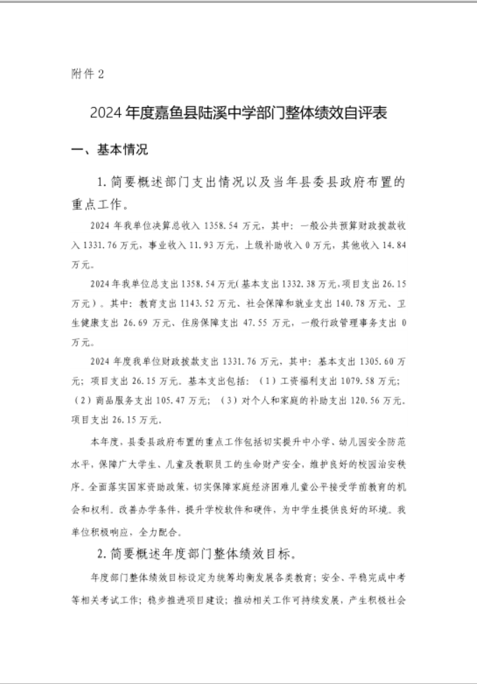 一、2024年度嘉鱼县陆溪中学整体绩效评价自评表或(报告)
