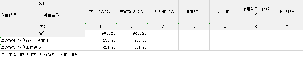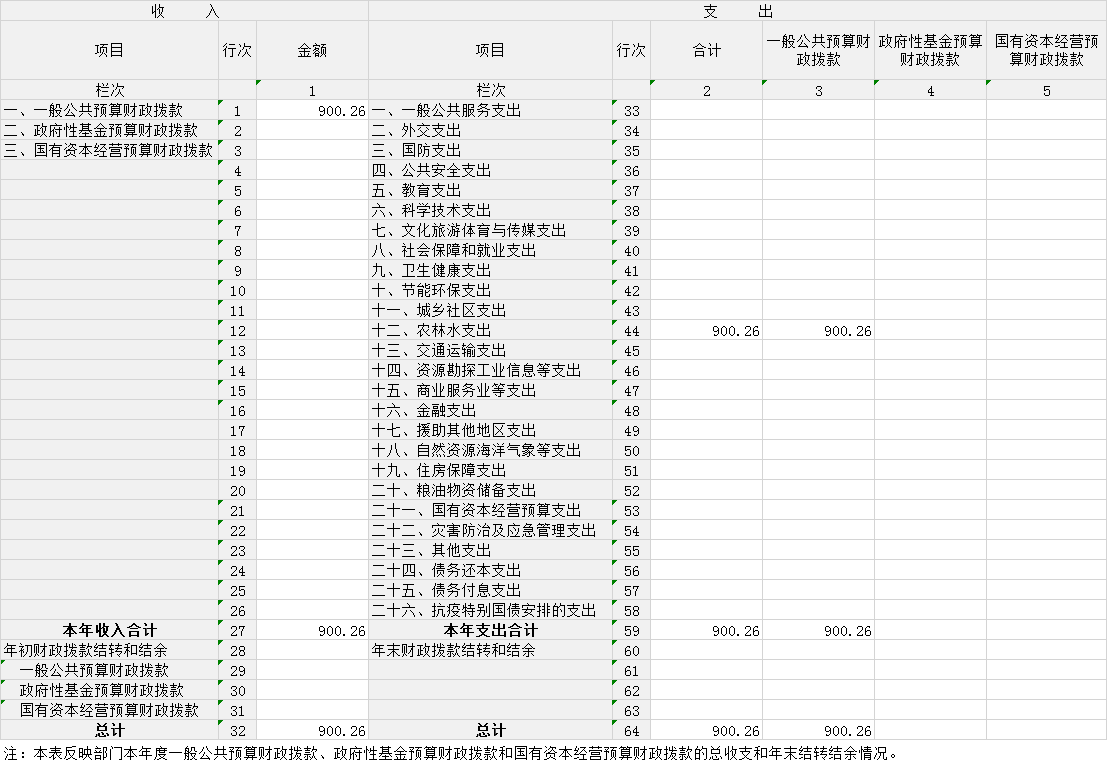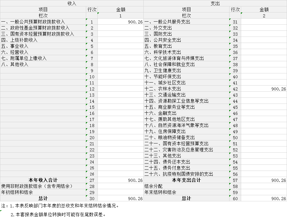 2024年度收、支总计均为900.26 万元。与2023年度相比,收、支总计各增加185.81万元,增长20.64 %,主要原因是三湖连江水库管理站增加项目资金。