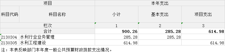 2024年度一般公共预算财政拨款支出900.26万元,占本年支出合计的100 %。与2023年度相比,一般公共预算财政拨款支出增加185.81万元,增长20.64%。主要原因是三湖连江水库管理站增加项目资金。