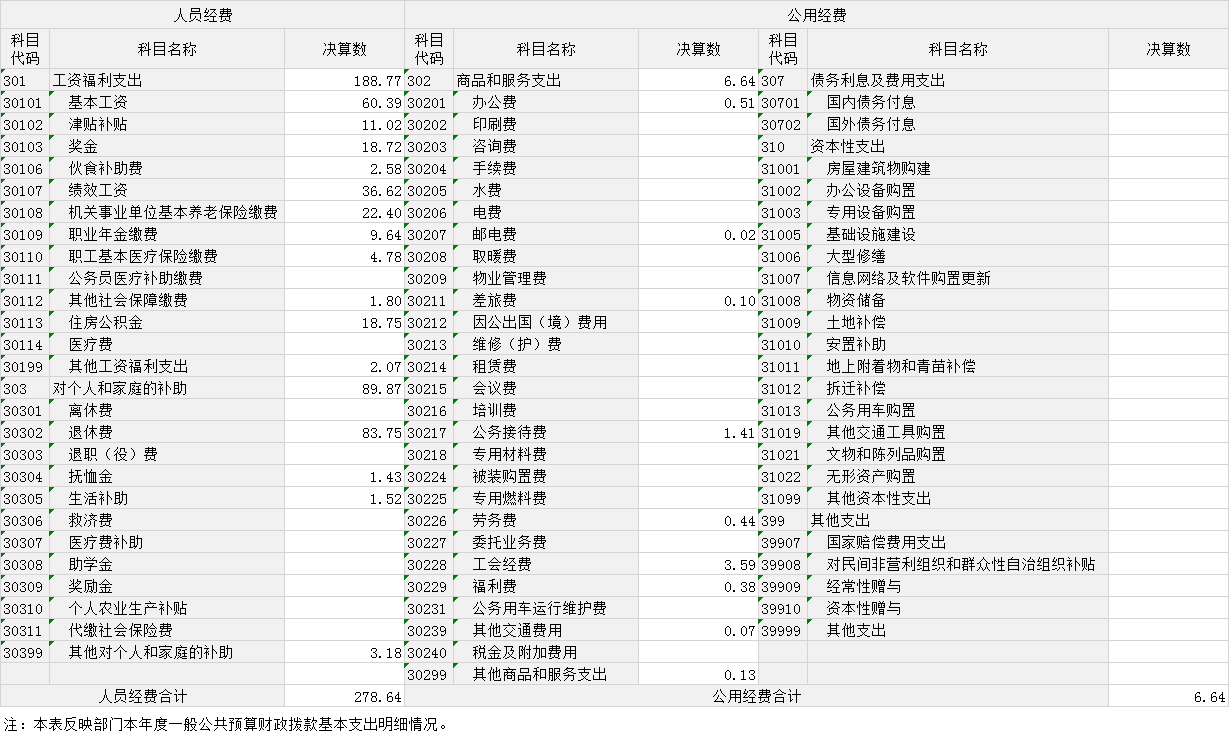 人员经费278.64万元,主要包括:基本工资60.39万元、津贴补贴11.02万元、奖金18.72万元、伙食补助费2.58万元、绩效工资36.62万元、机关事业单位基本养老保险缴费22.4万元、职业年金缴费9.64万元、职工基本医疗保险缴费4.78万元、其他社会保障缴费1.80万元、住房公积金18.75万元、其他工资福利支出2.07万元、退休费83.74万元、抚恤金1.43万元、生活补助1.52万元、其他对个人和家庭的补助3.18万元。