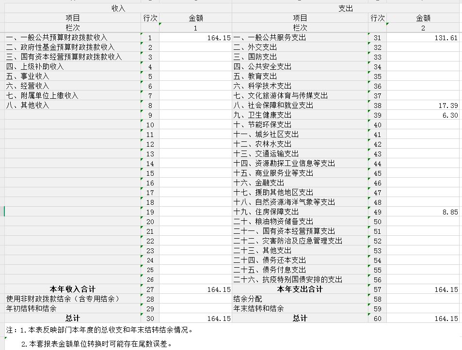 2024年度收、支总计均为164.15万元。与2023年度相比,收、支总计各减少44.32万元,下降21.26%,主要原因是2023年度有项目支出,2024年度无项目支出。