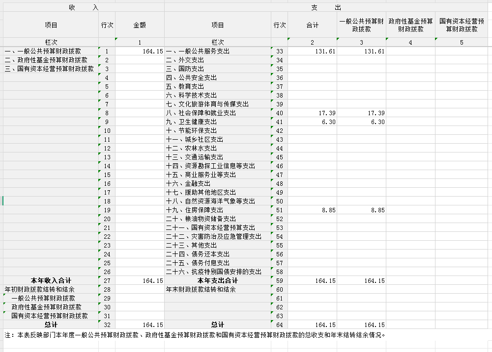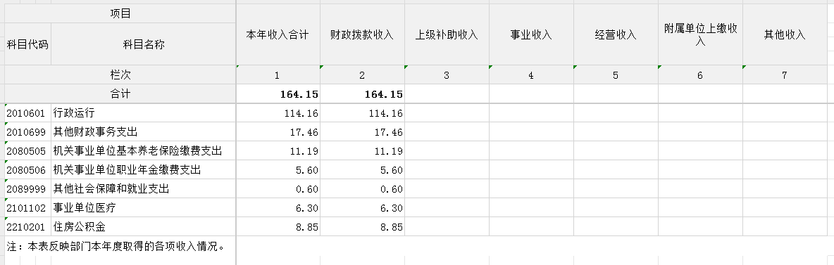 2024年度收入合计164.15万元,与2023年度相比,收入合计减少44.32万元,下降21.26%。其中:财政拨款收入164.15万元,占本年收入100%;上级补助收入0万元,占本年收入0%;事业收入0万元,占本年收入0%;经营收入0万元,占本年收入0%;附属单位上缴收入0万元,占本年收入0%;其他收入0万元,占本年收入0%。