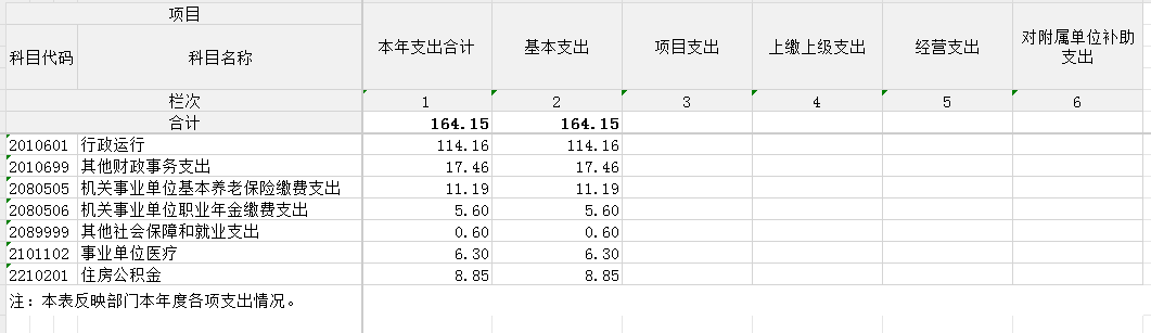2024年度支出合计164.15万元,与2023年度相比,支出合计减少44.32万元,下降21.26%。其中:基本支出164.15万元,占本年支出100%;项目支出0万元,占本年支出0%;上缴上级支出0万元,占本年支出0%;经营支出0万元,占本年支出0%;对附属单位补助支出0万元,占本年支出0%。
