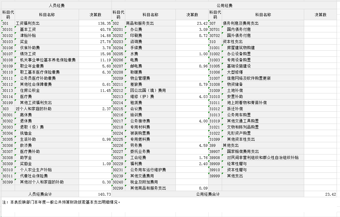 人员经费140.73万元,主要包括:基本工资、津贴补贴、奖金、伙食补助费、绩效工资、机关事业单位基本养老保险缴费、职业年金缴费、职工基本医疗保险缴费、其他社会保障缴费、住房公积金、生活补助、奖励金、其他对个人和家庭的补助。