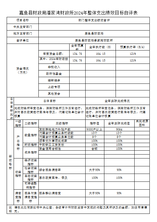 一、2024年度嘉鱼县财政局潘家湾财政所整体绩效评价自评表或(报告)
