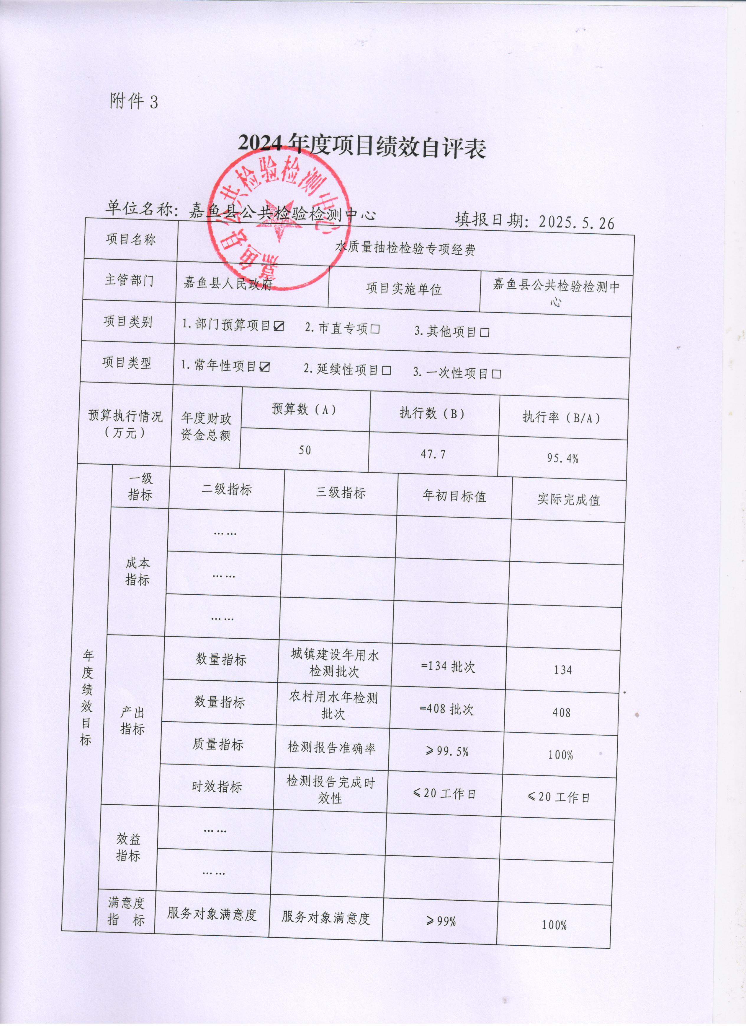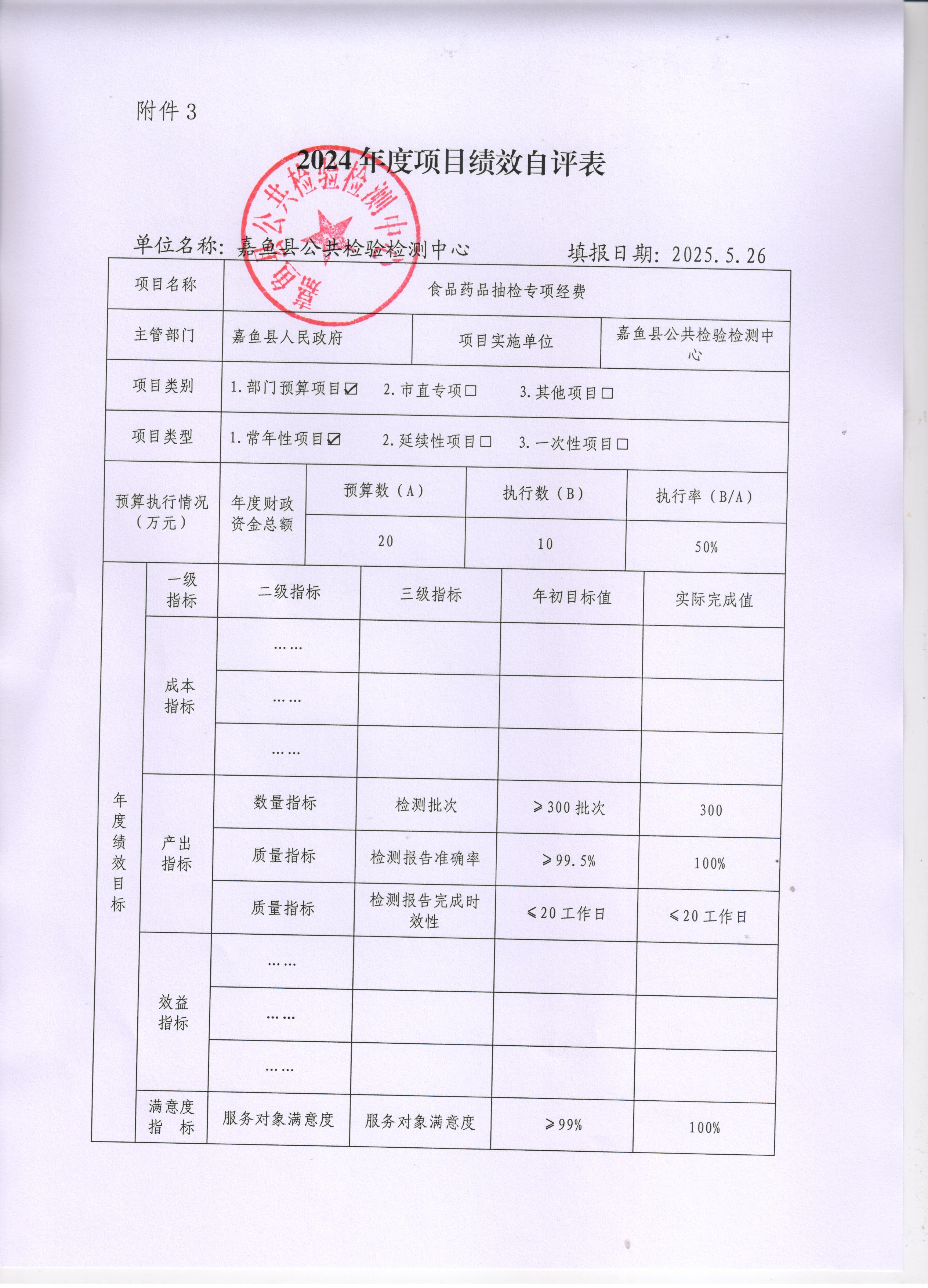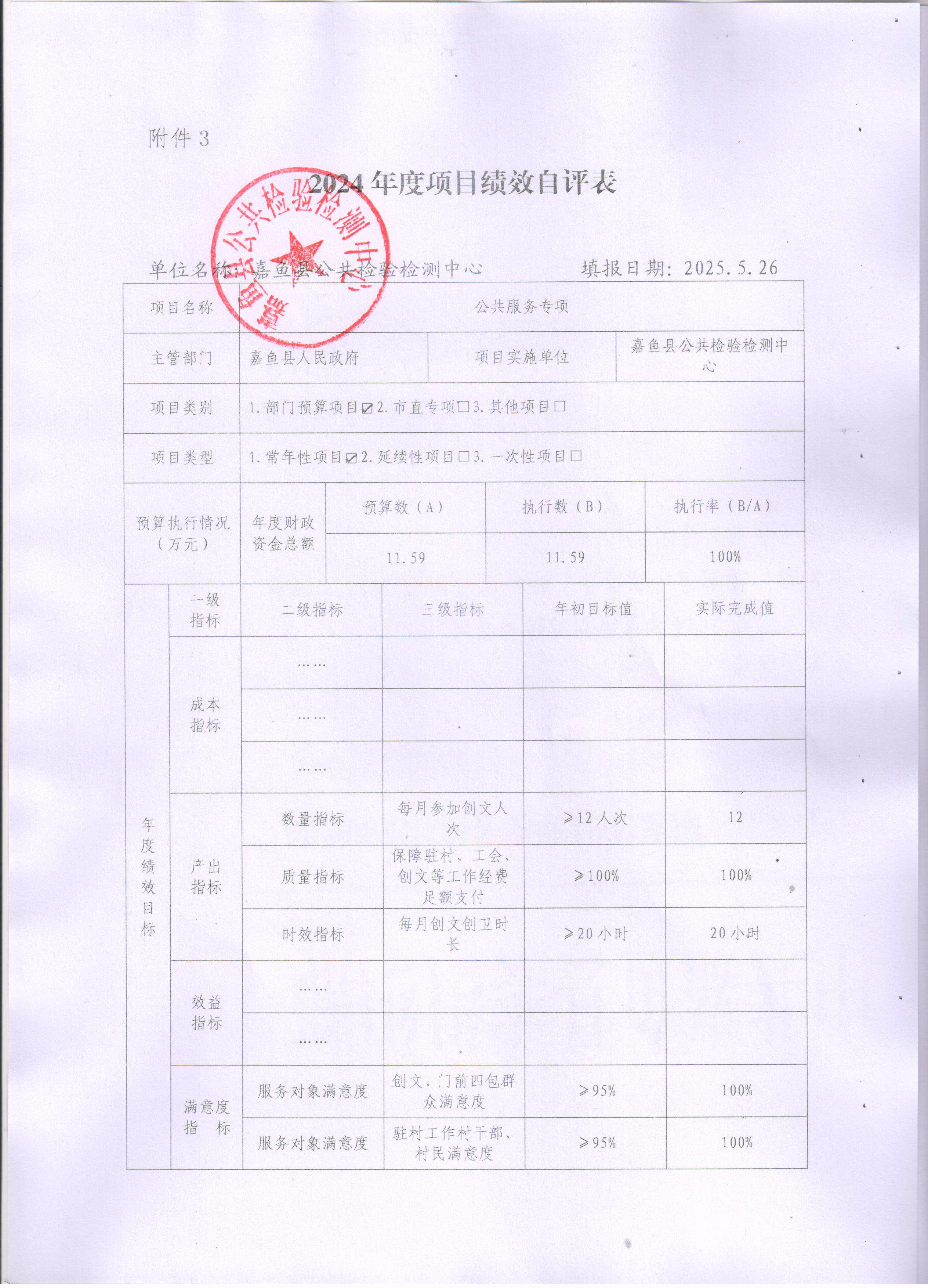 二、2024年度嘉鱼县公共检验检测中心项目绩效评价自评表