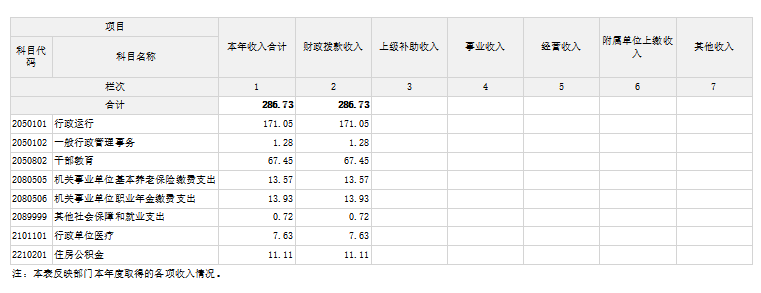 2024年度收入合计286.73万元,与2023年度相比,收入合计增加5.38万元,增长1.91%。其中:财政拨款收入286.73万元,占本年收入100%;上级补助收入0.00万元,占本年收入0%;事业收入0.00万元,占本年收入0%;经营收入0.00万元,占本年收入0%;附属单位上缴收入0.00万元,占本年收入0%;其他收入0.00万元,占本年收入0%。