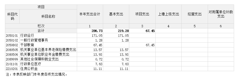 2024年度支出合计286.73万元,与2023年度相比,支出合计增加5.38万元,增长1.91%。其中:基本支出219.28万元,占本年支出76.48%;项目支出67.45万元,占本年支出23.52%;上缴上级支出0.00万元,占本年支出0%;经营支出0.00万元,占本年支出0%;对附属单位补助支出0.00万元,占本年支出0%。