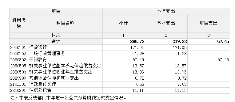 2024年度一般公共预算财政拨款支出286.73万元,占本年支出合计的100%。与2023年度相比,一般公共预算财政拨款支出增加5.38万元,增长1.91%。主要原因是增加了项目支出。