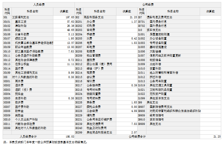 公用经费21.25万元,主要包括:办公费、水费、电费、公务接待费、劳务费、委托业务费、工会经费、其他交通费用、其他商品和服务支出。