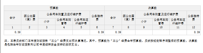 3.公务接待费全年预算为0.39万元,支出决算为0.39万元,完成全年预算的100%,较上年增加了0.12万元,增长44.44%。决算数等于全年预算数的主要原因是严格贯彻落实中央关于厉行节约的要求,简化接待,控制陪餐人数。其中:
