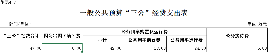 2.“三公”经费:指使用一般公共预算财政拨款安排的因公出国(境)费、公务用车购置及运行维护费和公务接待费。其中,因公出国(境)费用反映单位公务出国(境)的国际旅费、国外城市间交通费、住宿费、伙食费、培训费、公杂费等支出;公务用车购置及运行维护费反映单位公务用车车辆购置支出(含车辆购置税、牌照费)、燃料费、维修费、过桥过路费、保险费、安全奖励费用等支出;公务接待费反映单位按规定开支的各类公务接待(含外宾接待)费用。