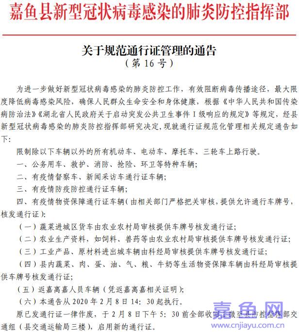 名       称: 关于规范通行证管理的通告(第16号) 发布日期: 2020年02月08日